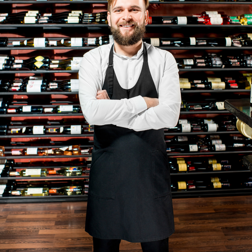 Tablier sommelier personnalisé : version longue avec poches multiples, idéal pour les serveurs.