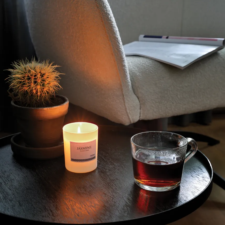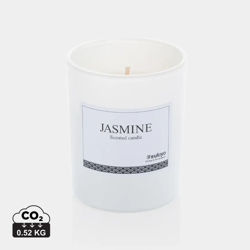 Bougie parfumée personnalisable au subtil parfum de jasmin, présentée dans un pot élégant en verre. Idéale pour créer une atmosphère chaleureuse et apaisante en contexte professionnel.