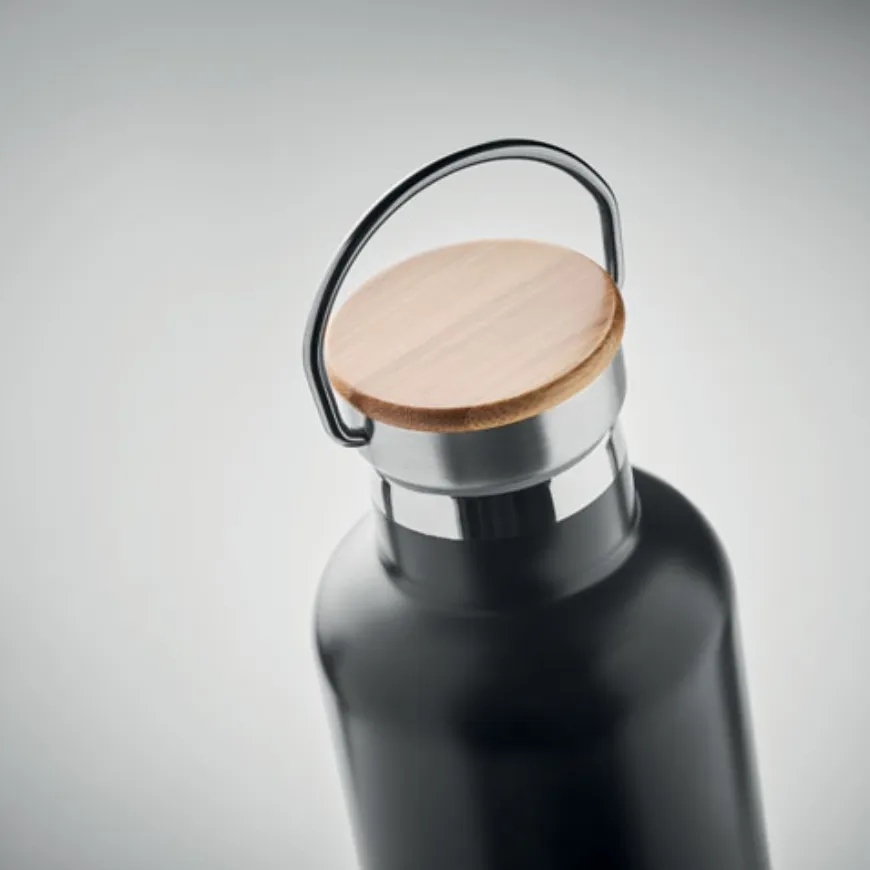 Fabriquée en acier inoxydable, cette bouteille dispose d’une double paroi isolante permettant de conserver efficacement les boissons chaudes ou froides. Elle est équipée d’un couvercle en bambou avec une poignée de transport facilitant son utilisation et apportant une finition naturelle et élégante.