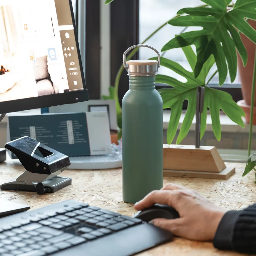 Fabriquée en acier inoxydable, cette bouteille dispose d’une structure à paroi simple légère et résistante. Son couvercle anti-fuite avec poignée de transport permet une utilisation facile au quotidien, au bureau comme en déplacement.