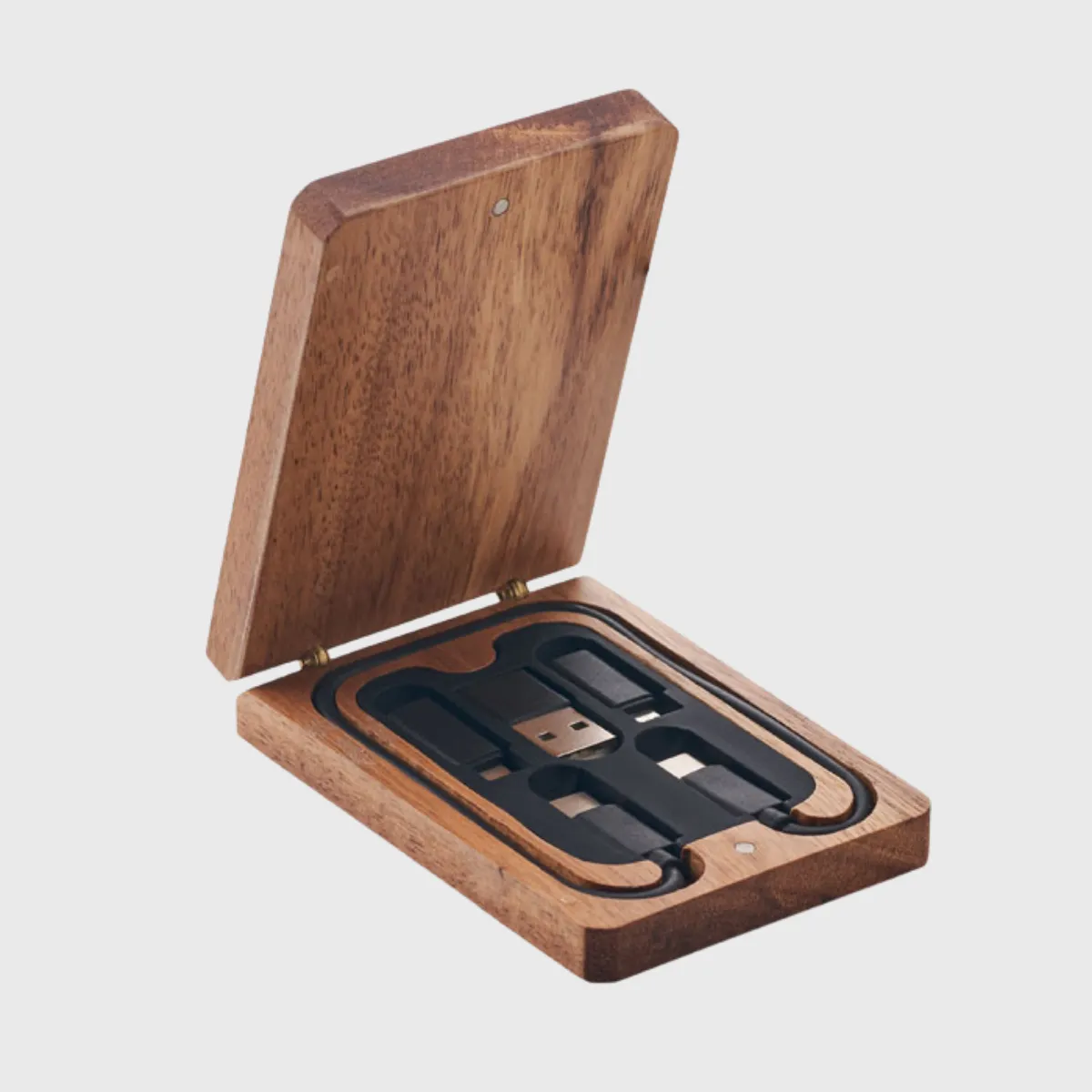Câble de charge personnalisable 3-en-1 avec différents connecteurs, présenté dans une boîte en bois. Compact et pratique, il s’adapte aux usages quotidiens et se transporte facilement.