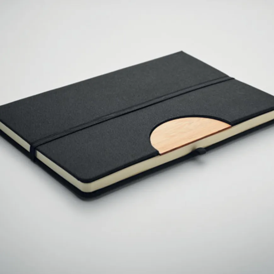 Le carnet personnalisable MO6576 est bien plus qu’un simple bloc-notes. Sa couverture rigide en RPET 600D, issue de matériaux recyclés, s’orne d’un élégant détail en bambou qui se transforme ingénieusement en support pour smartphone — idéal pour les réunions ou les visioconférences.