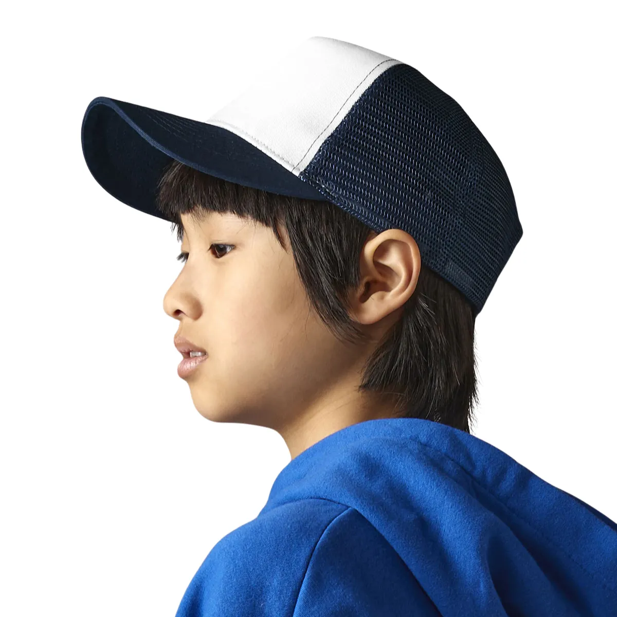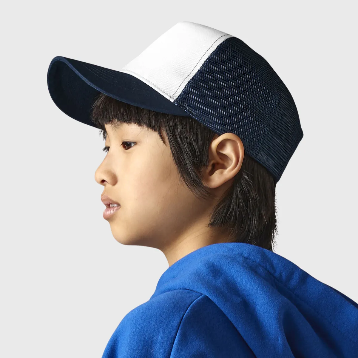 Casquette filet junior snapback — panneau avant et visière 100% coton, panneaux filet respirants, fermeture réglable. 7 coloris disponibles, personnalisable en broderie ou impression.