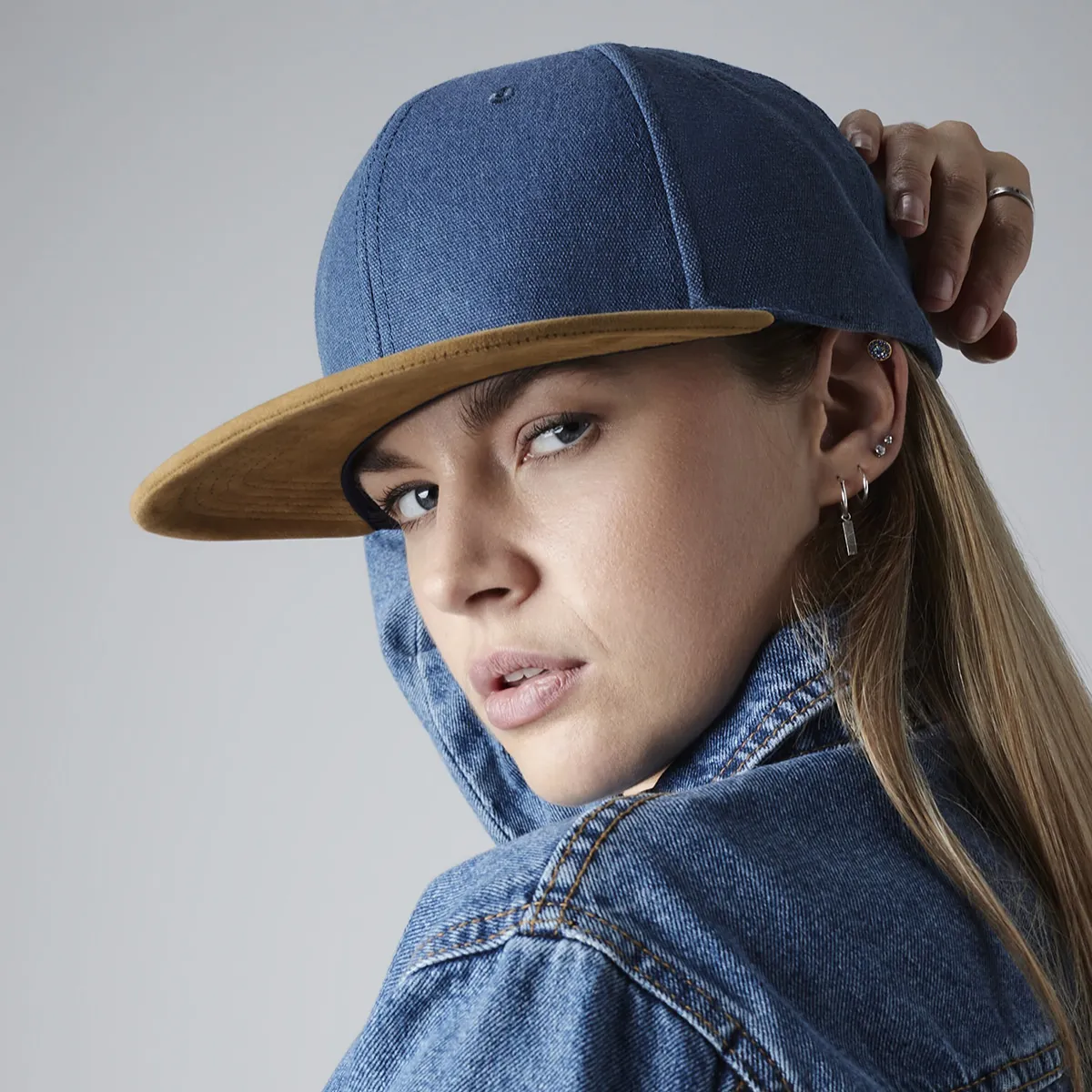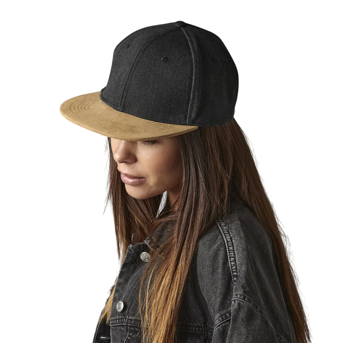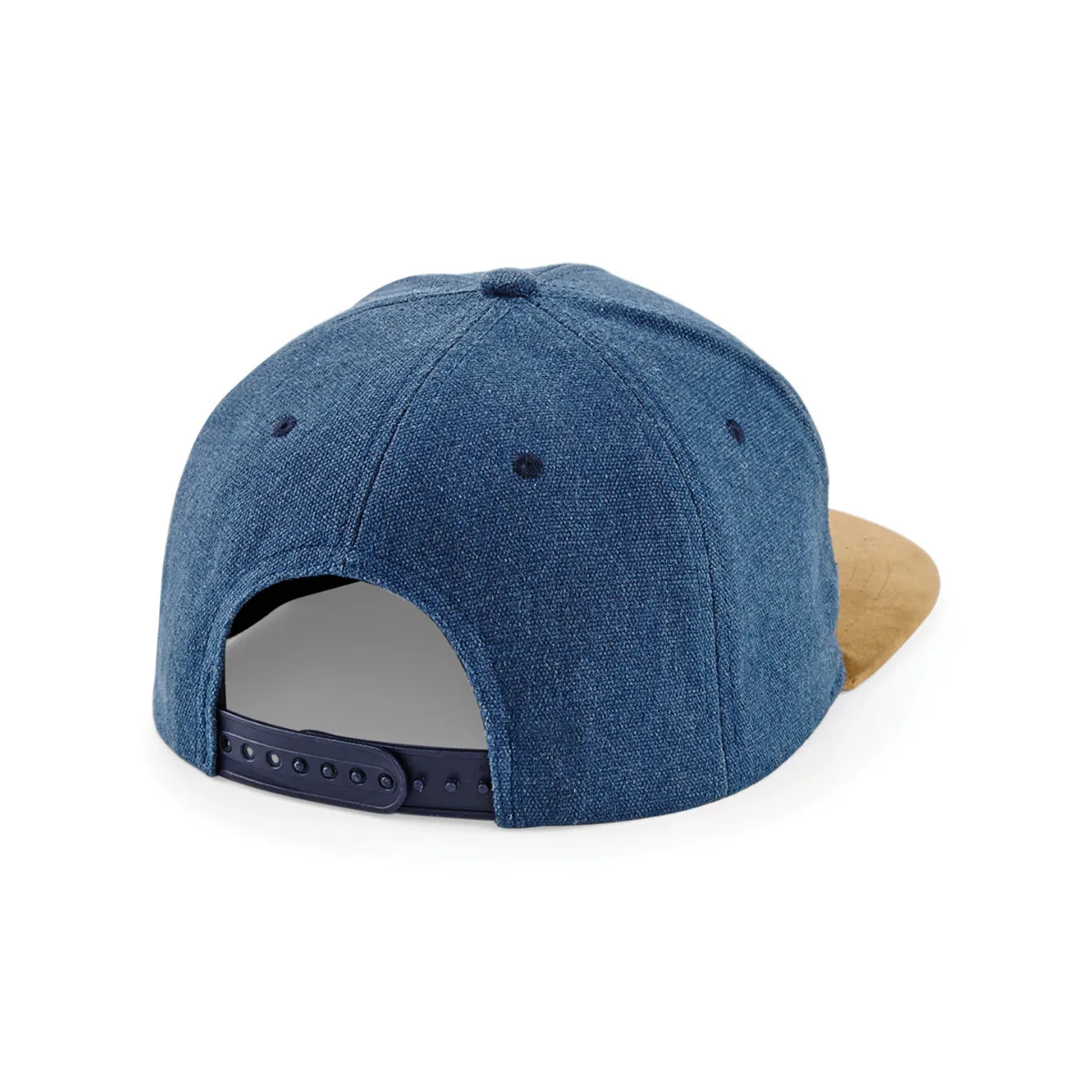 Casquette snapback visière plate imitation daim, coton délavé, 87g, taille unique réglable. Étiquette TearAway™ détachable. BEECHFIELD BC668.
