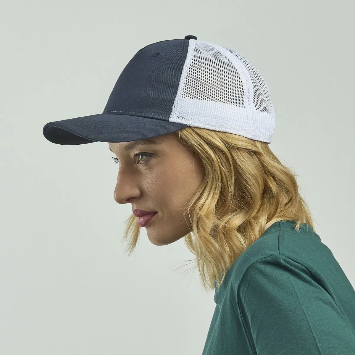 Découvre cette casquette trucker personnalisable recyclée légère et respirante. Sa construction 5 panneaux et filet recyclé assure confort au quotidien. La fermeture par patte permet un ajustement simple.