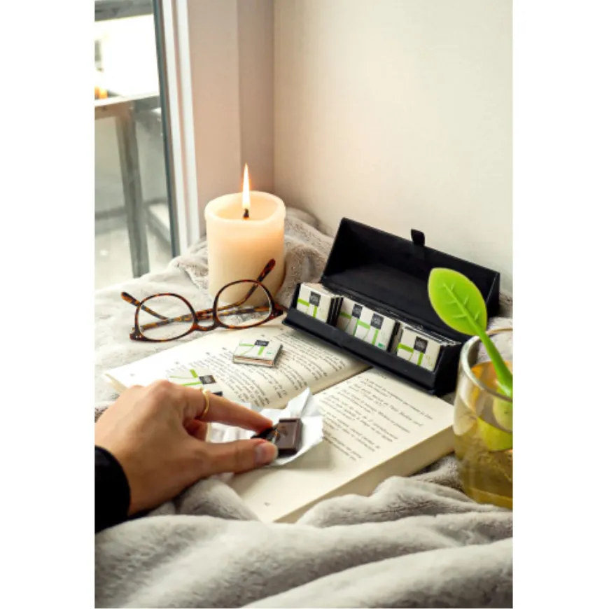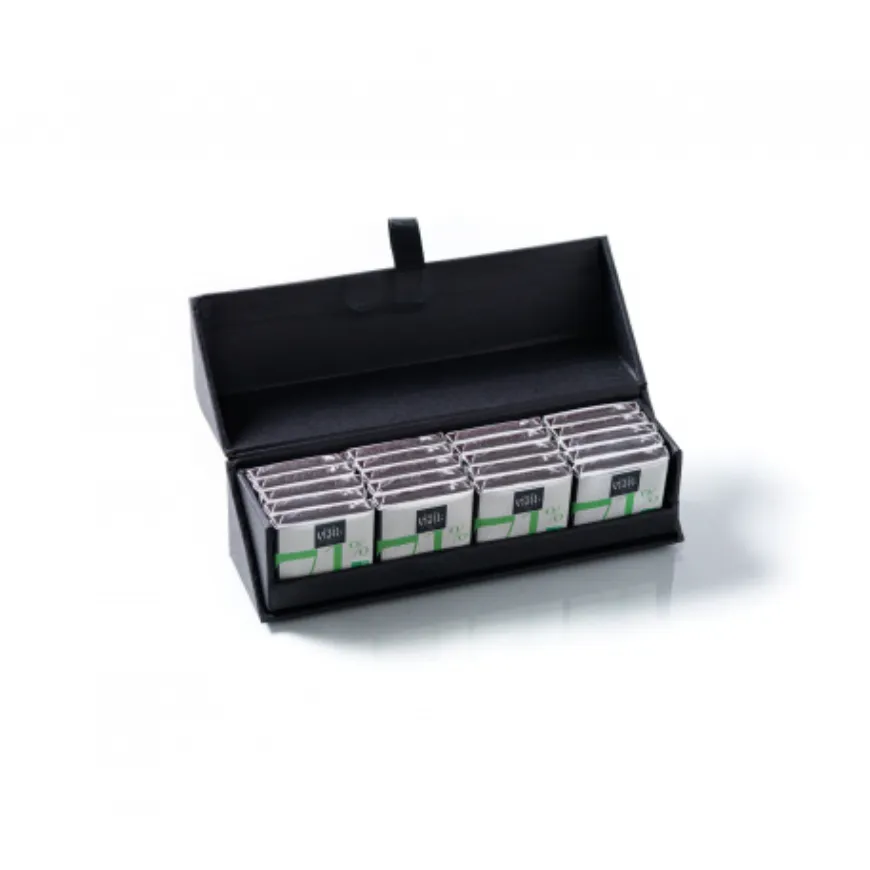 Mets en avant ton image avec ce coffret de chocolats personnalisable composé de 20 carrés de chocolat noir 71 % bio et équitable. Présenté dans un coffret aimanté en carton recyclé avec finition dorée à chaud, il est idéal pour les cadeaux clients et les opérations de communication premium.