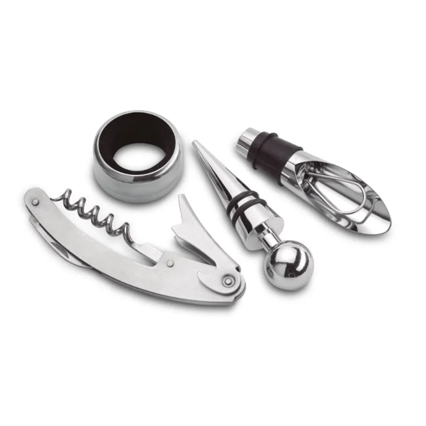 L’ensemble comprend un tire-bouchon, un bouchon, un bec verseur et un anneau anti-gouttes, tous conçus en acier inoxydable. Les accessoires sont soigneusement disposés dans la boîte pour garantir un maintien propre et organisé.