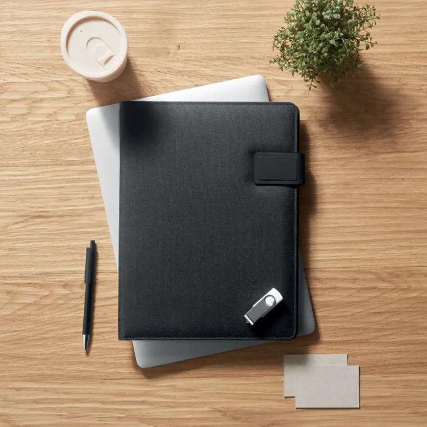 Le conférencier personnalisable MO2495 allie élégance et technologie. Conçu au format A4 avec une couverture en polyuréthane, il intègre une power bank de 5000 mAh et un chargeur magnétique sans fil 15W. Idéal pour les professionnels en déplacement, il dispose de multiples compartiments et d’un bloc-notes de 20 pages lignées pour une organisation optimale.