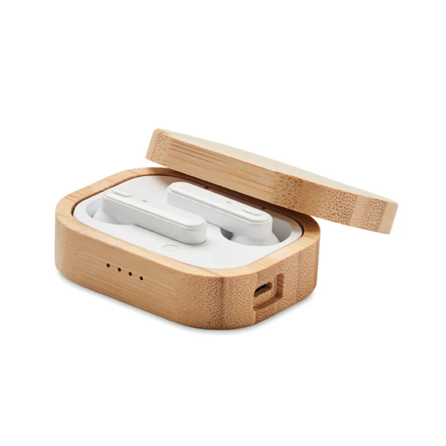 Associe élégance et durabilité avec les écouteurs sans fil personnalisables JAZZ BAMBOO. Leur boîtier en bambou naturel séduit par son look raffiné et son toucher agréable, parfait pour les marques sensibles à l’éco-design.