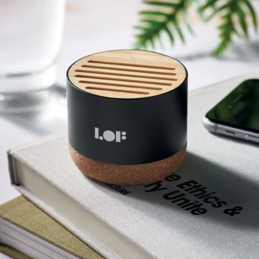Le haut-parleur personnalisable RUMBA MO2205 associe un design premium en aluminium recyclé à une base en liège naturel et bambou. Connectivité Bluetooth 5.3, batterie rechargeable et son clair de 3 W : un accessoire élégant pour entreprises, agences et associations.