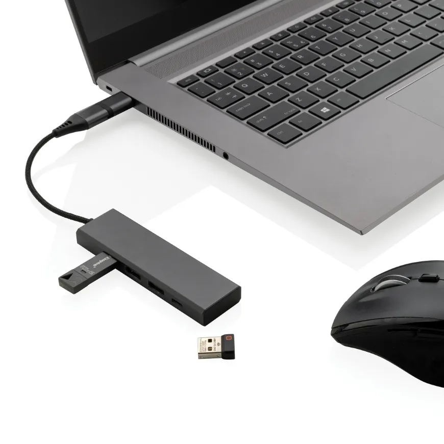 Hub USB personnalisable fabriqué en aluminium recyclé certifié RCS, équipé de 4 ports (3 USB-A + 1 USB-C). Compact et écoresponsable, il permet de connecter facilement plusieurs appareils à un ordinateur USB-A ou USB-C.