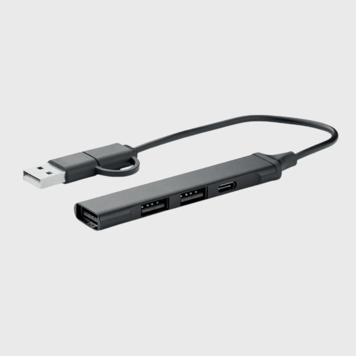 Hub USB personnalisable 4 ports en aluminium recyclé, conçu pour étendre facilement la connectivité de ton ordinateur. Il combine 3 ports USB-A et 1 port USB-C, avec une double entrée Type-C et Type-A pour une compatibilité maximale.