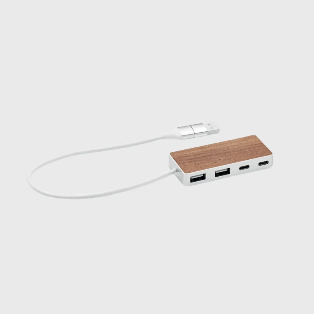 Hub USB personnalisable 4 ports dans un boîtier en aluminium recyclé avec finition en noyer. Il propose 2 ports USB-A et 2 ports USB-C avec une entrée 2-en-1 Type-C et Type-A, pour une connectivité simple et polyvalente au bureau.