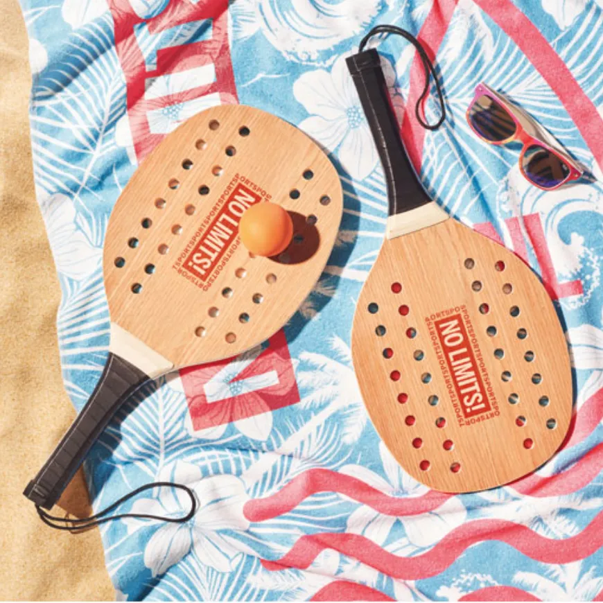 Le set de raquettes de plage personnalisable MO6846 est un incontournable de la belle saison. Fabriqué en bois FSC 100 % avec un grip en PU, il offre confort, légèreté et durabilité pour jouer sur la plage ou en extérieur.