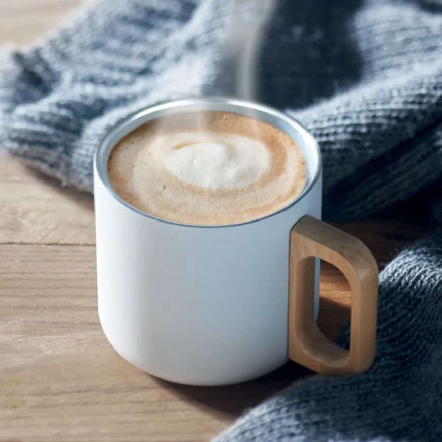 Découvre ce mug personnalisable à double paroi en acier inoxydable recyclé avec sa poignée en bois élégante. Une capacité de 350 ml idéale pour tes boissons chaudes au quotidien, avec un engagement écoresponsable fort.