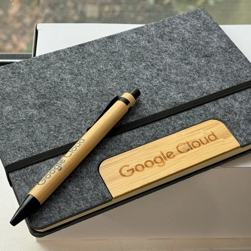 Carnet gravé avec stylo floqué pour un séminaire Google Cloud.