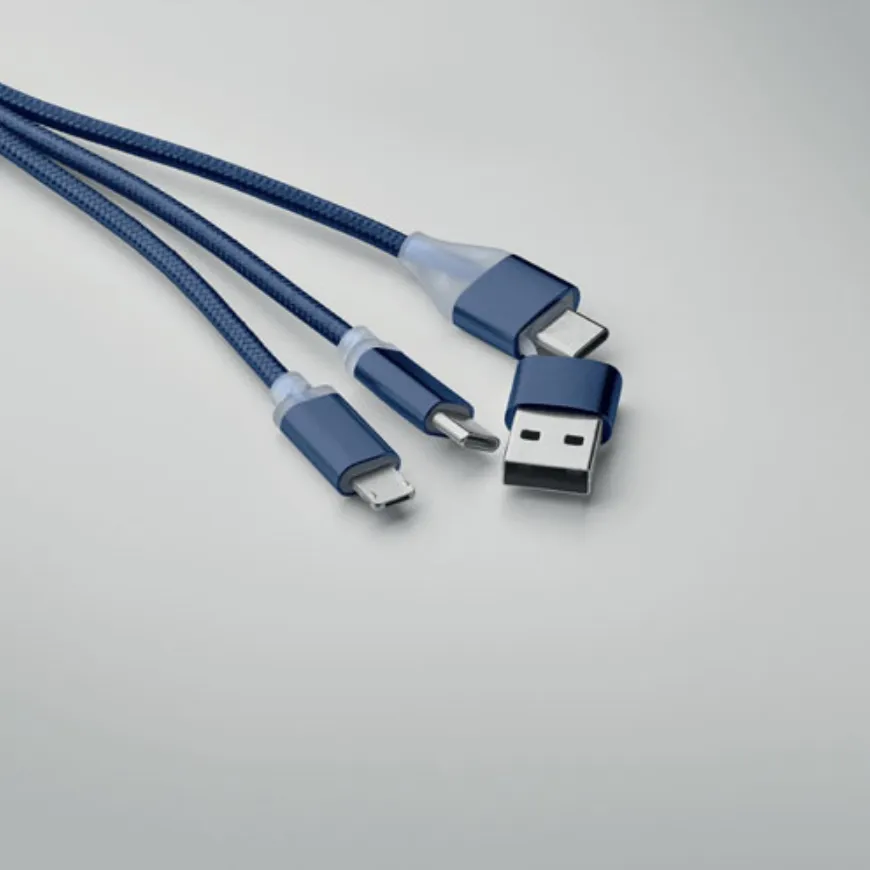 On propose des câbles multi-connecteurs (USB-A, USB Type-C, Lightning, Micro-USB) qui couvrent 98 % des appareils : parfaits pour un événement, un cadeau client ou un pack goodies promotionnels.