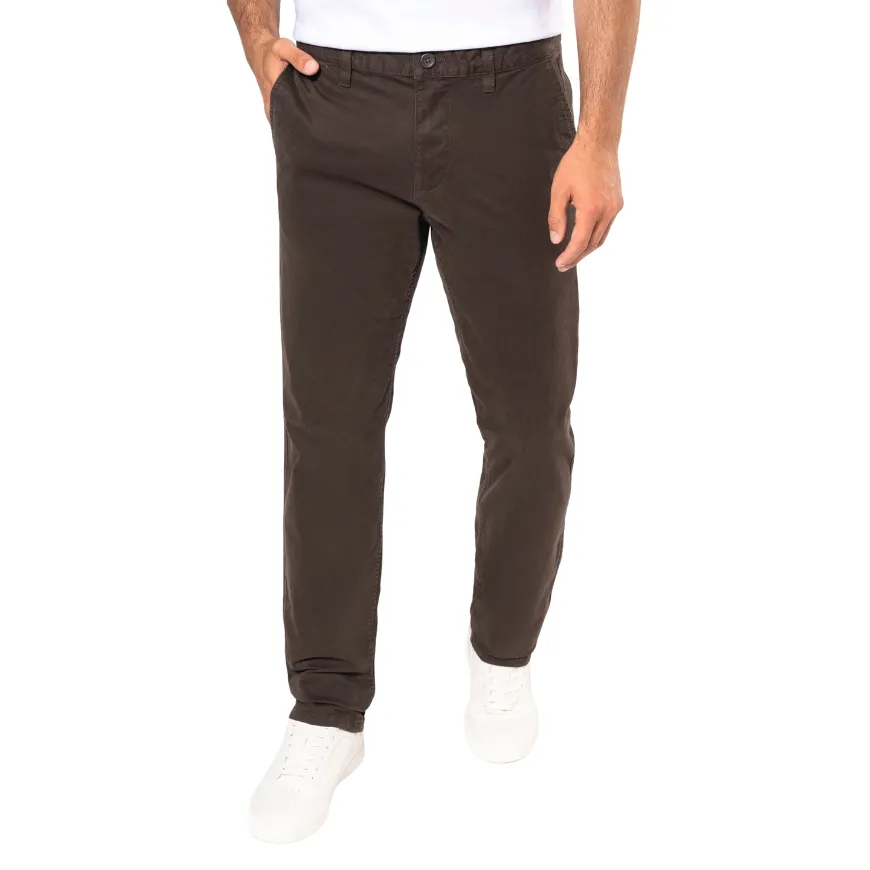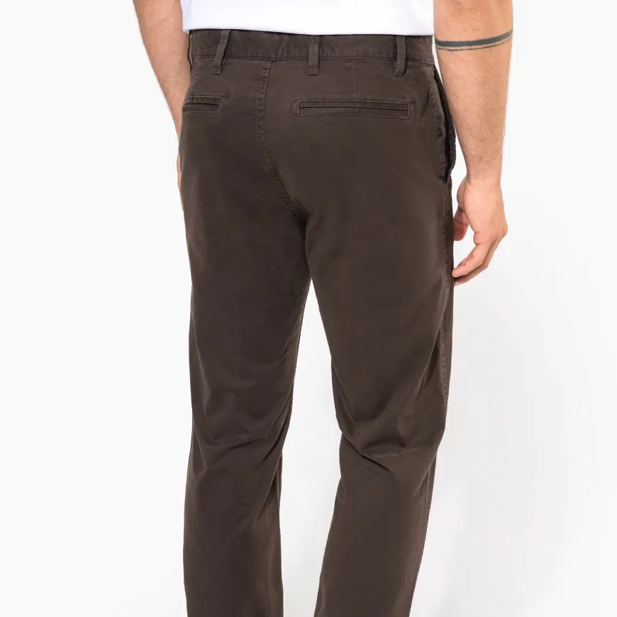 Le pantalon chino personnalisable Kariban K740 associe une coupe moderne et tendance à un tissu lavé aux enzymes 245 g/m² pour un confort durable et une imprimabilité optimale.