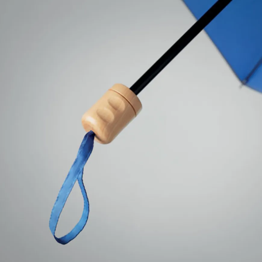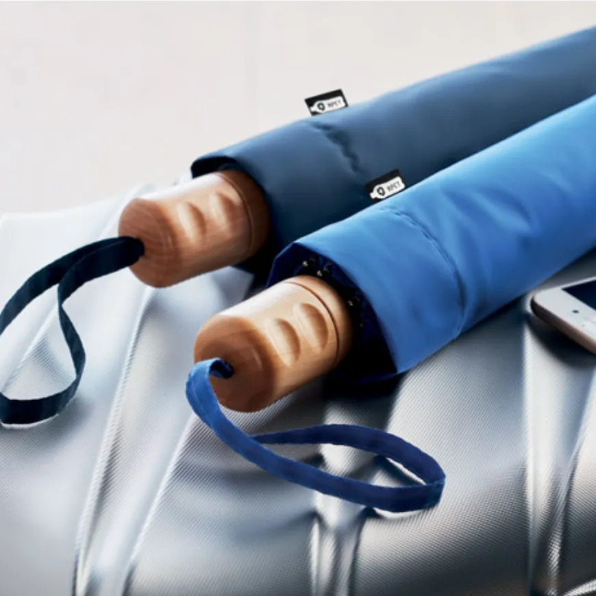 Découvre ce parapluie pliable personnalisable de 21 pouces, fabriqué en pongé 190T RPET (jusqu’à 50 % de matériaux recyclés). Avec son mât et ses baleines en métal plaqué noir et son manche en bois, il allie élégance naturelle et engagement écoresponsable. Ouverture et fermeture manuelles. Pochette individuelle incluse.