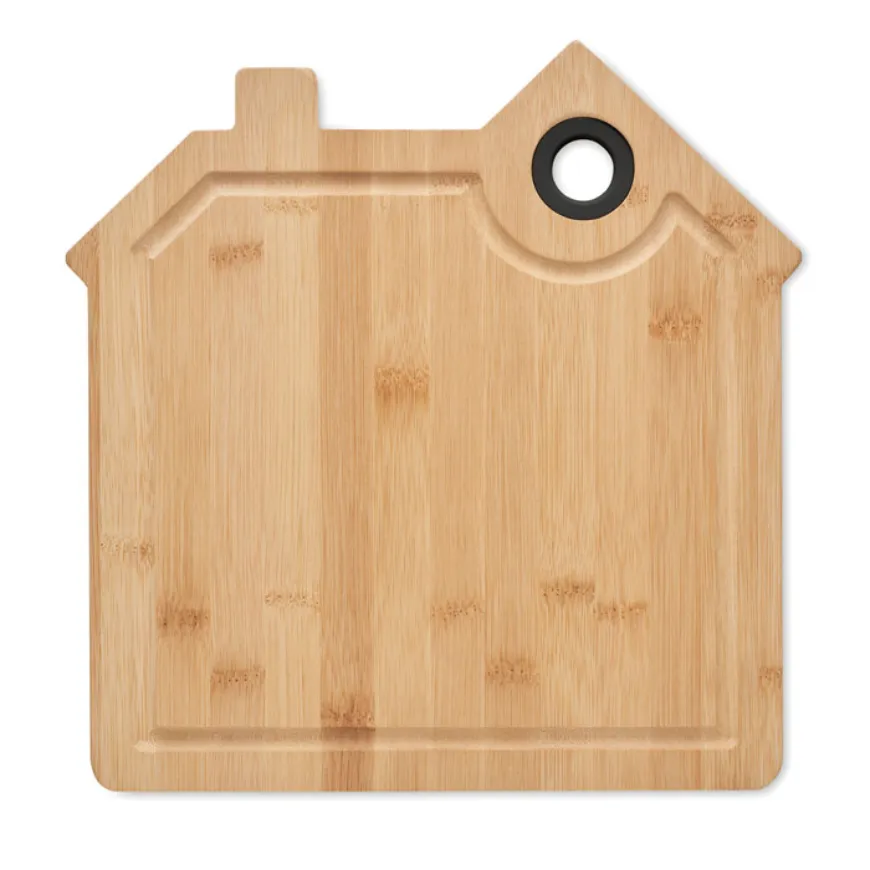 Planche à découper personnalisable en bambou, avec rainure intégrée et trou de suspension. Un format original en forme de maison, idéal pour un usage cuisine ou une présentation soignée.