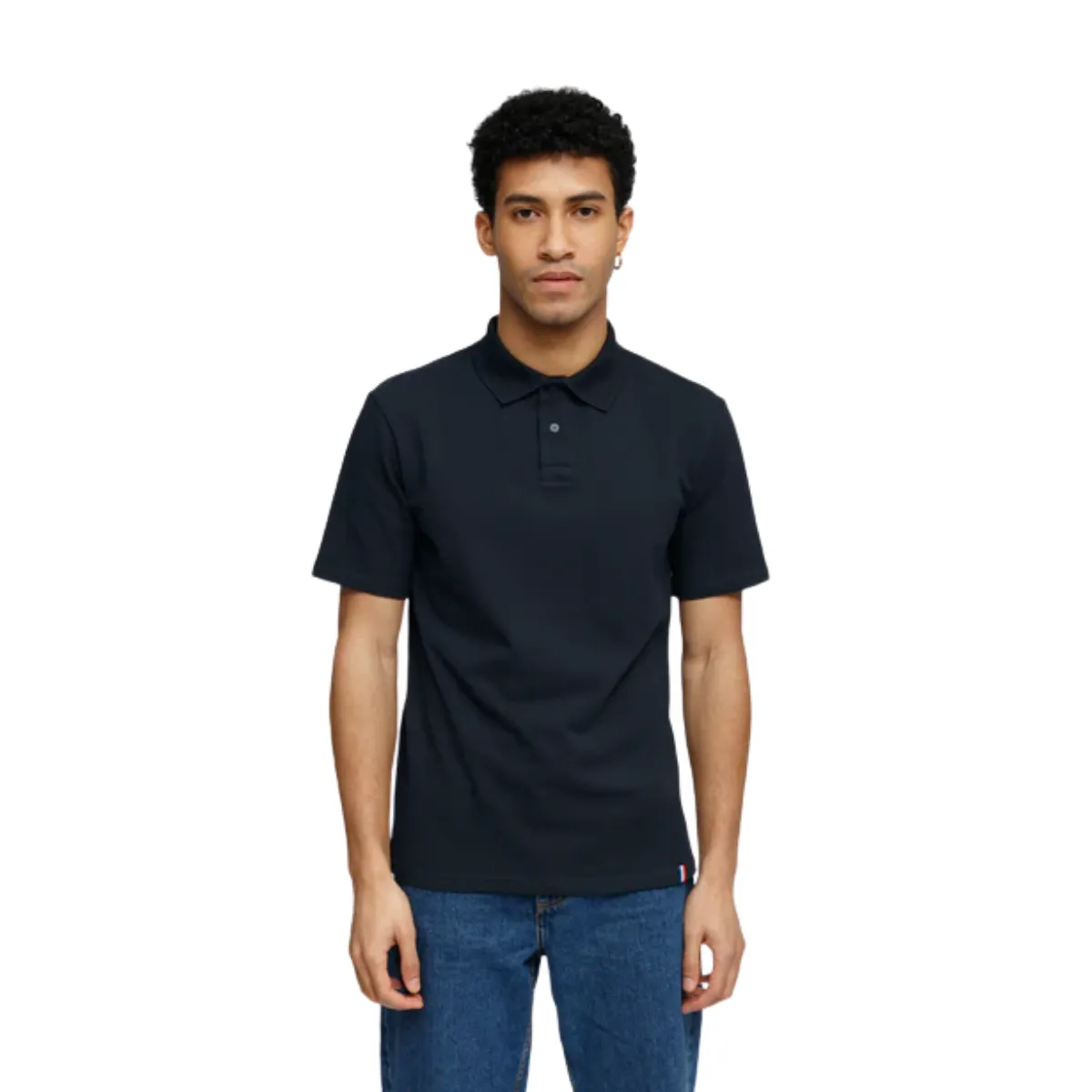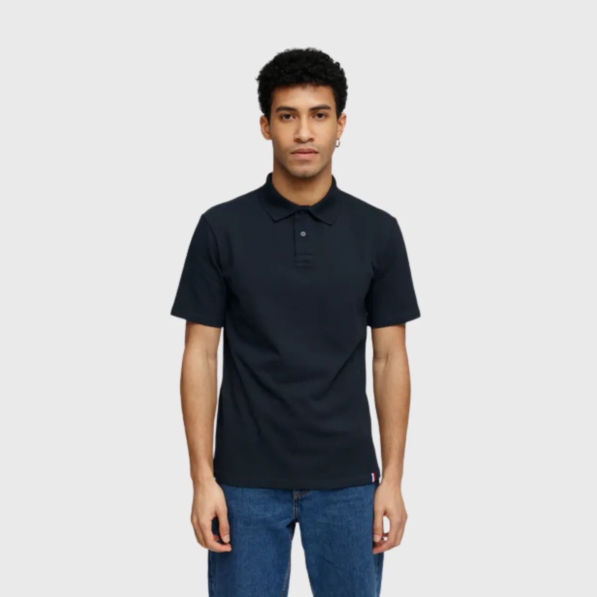 Le coton filé et peigné apporte un toucher doux et une bonne tenue. La patte de boutonnage 2 boutons avec col en bord-côtes conserve sa forme au lavage. La bande de propreté intérieure au col finit proprement l’encolure. Les surpiqûres doubles en bas de manches et bas de corps renforcent la durabilité. Un détail ruban tricolore en bas à gauche signe la fabrication française.