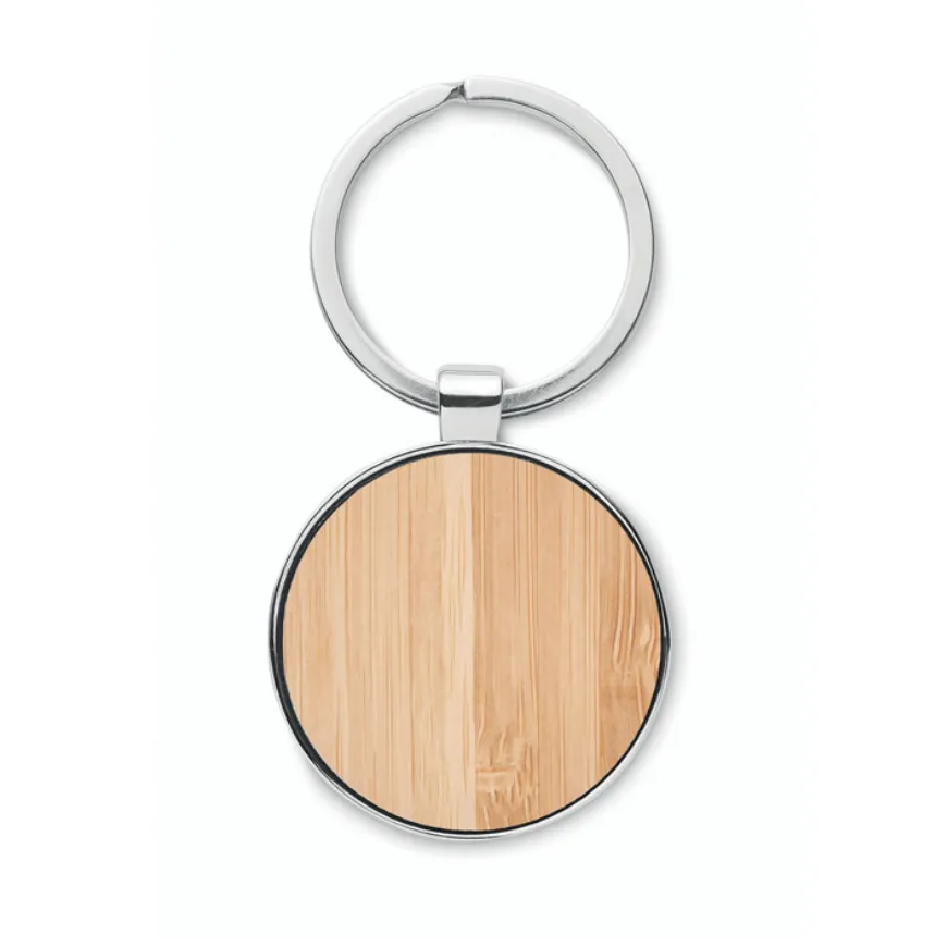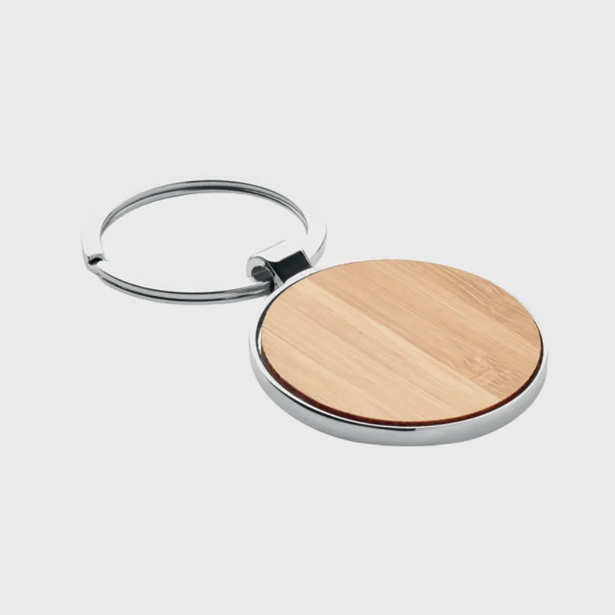 Porte-clés personnalisable de forme ronde, sobre et efficace pour ta communication. Son alliage de zinc associé à une surface en bambou offre un rendu naturel et moderne. Un objet utile, facile à distribuer et visible au quotidien.