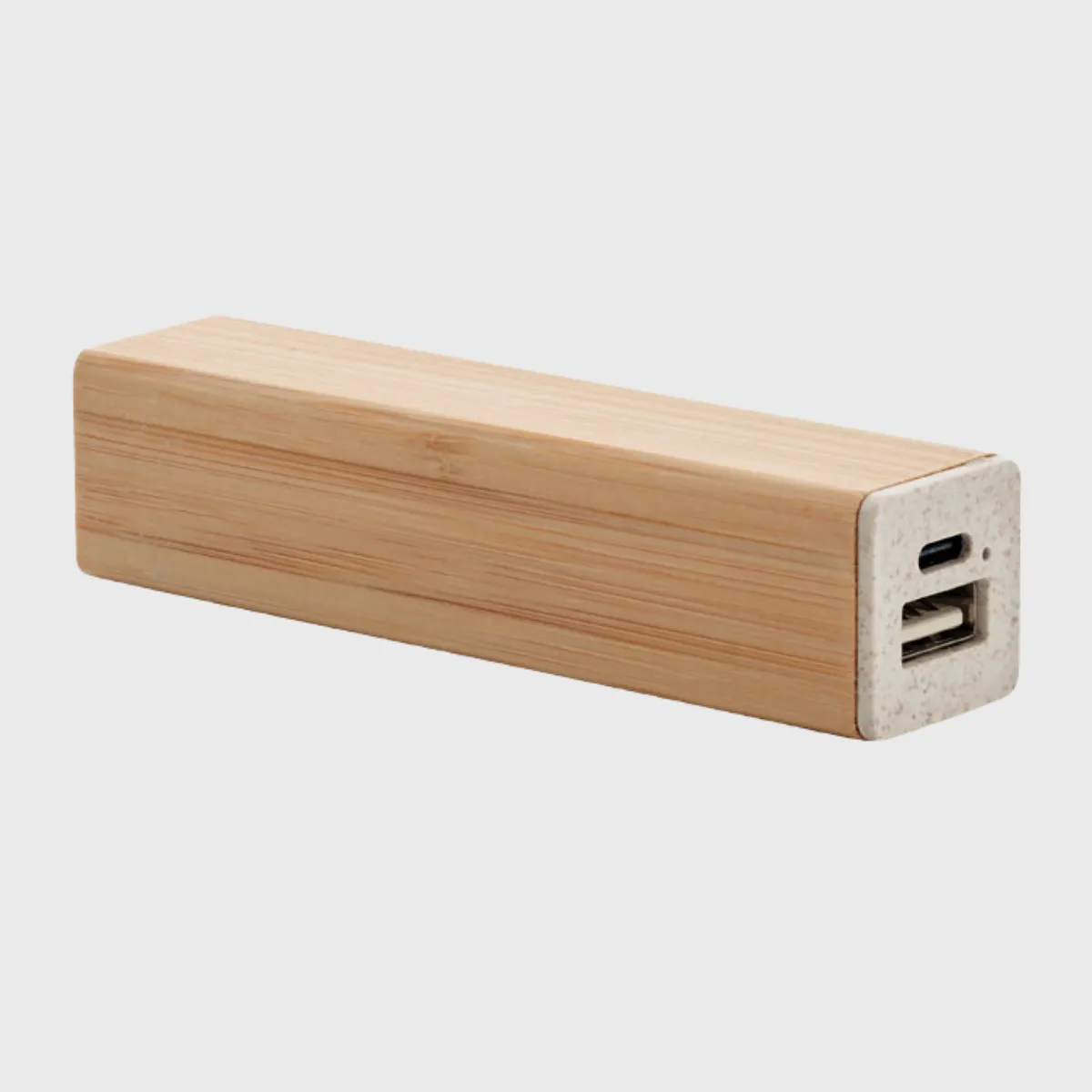Cette powerbank personnalisable en bambou offre une solution de recharge simple et nomade pour les smartphones. Son format compact et sa capacité de 2 600 mAh en font un accessoire pratique à emporter partout.