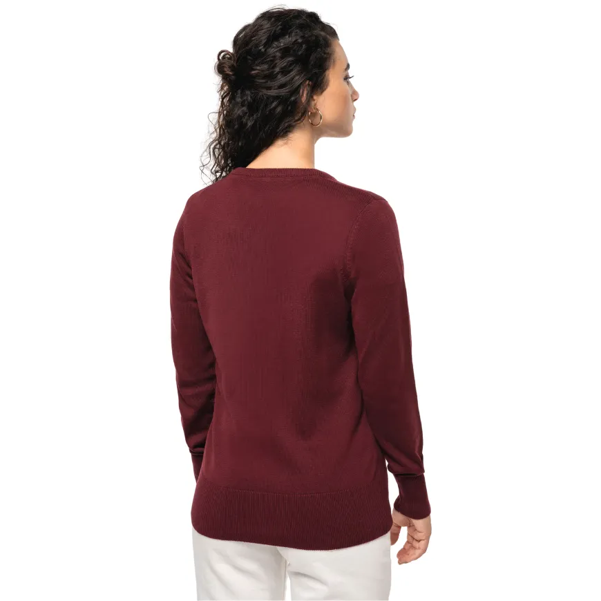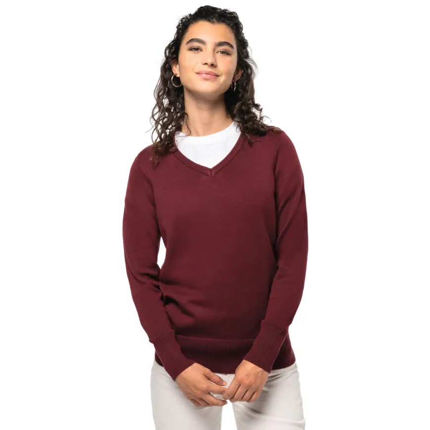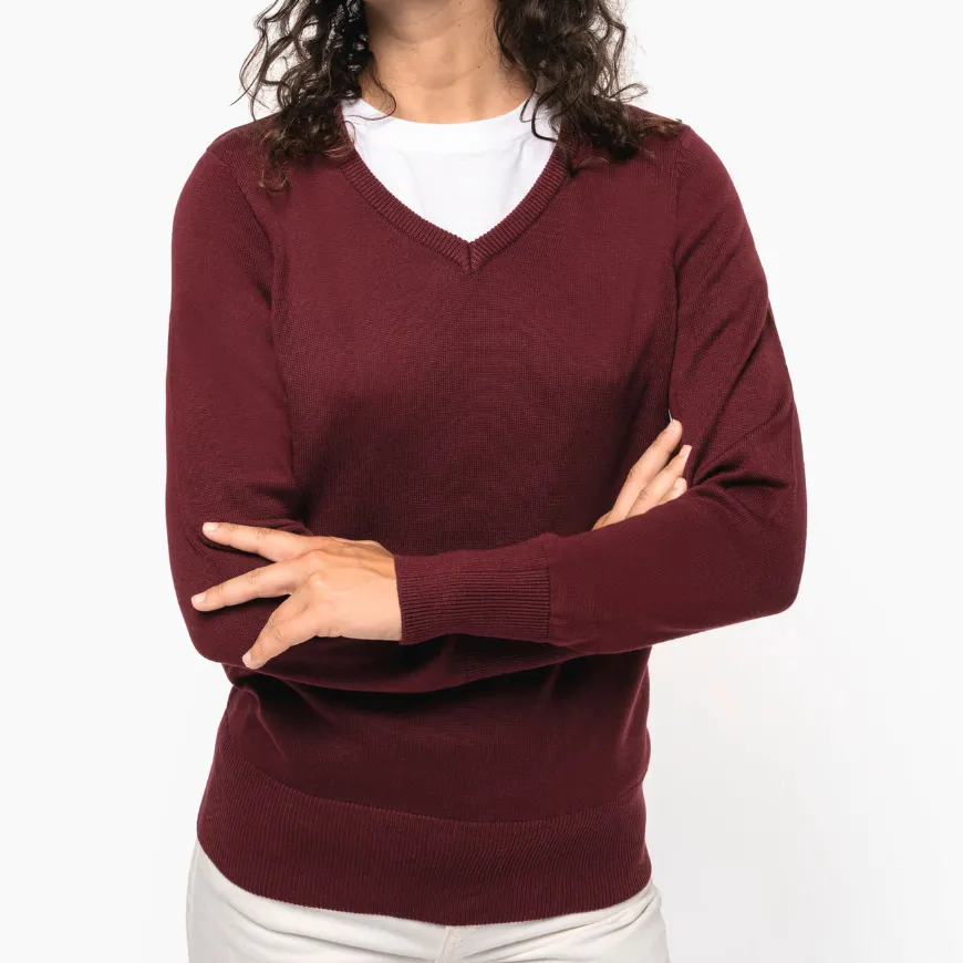 Le pull col V femme personnalisable KARIBAN allie élégance et confort. Sa coupe cintrée et sa texture légère offrent un tombé impeccable pour équiper ton équipe avec style.