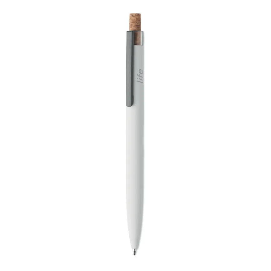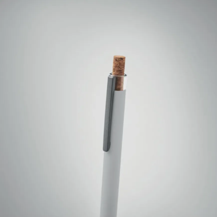 Stylo bille personnalisable au design épuré avec un corps en aluminium recyclé. Bouton poussoir en liège et clip en métal pour une finition soignée. Encre bleue, adaptée à un usage professionnel quotidien.