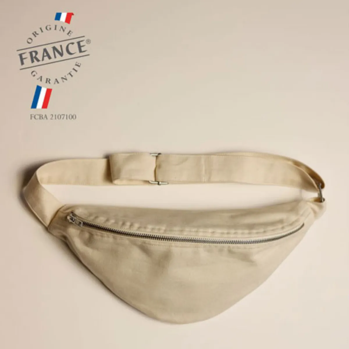 Un sac banane personnalisable tissé et fabriqué en France, en 50 % coton recyclé / 50 % coton sanforisé pour une résistance accrue. Ceinture double épaisseur, boucles métalliques réglables et fermeture à glissière tirette métal — une qualité premium made in France. Idéal pour les marques et événements exigeants.