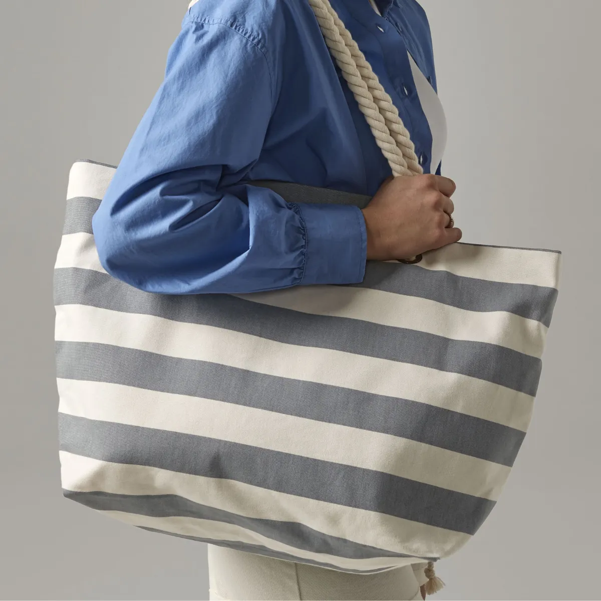Le design pensé dans les moindres détails fait toute la différence : anses en corde épaisse de 60 cm pour un look nautical authentique et un portage confortable à la main ou sur l’épaule, finitions soignées et structure renforcée qui maintient parfaitement la forme du sac. Les coloris bicolores rayés apportent une touche moderne et élégante, parfaite pour véhiculer une image de marque dynamique et estivale auprès de tes clients ou équipes.