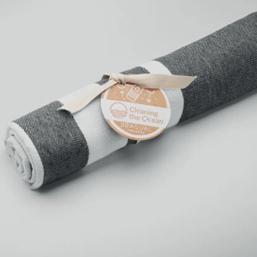 La serviette personnalisable MO2058 est fabriquée en 70% coton recyclé et 30% polyester recyclé SEAQUAL® YARN. Épais et résistant (300 g/m²), ce textile unique contribue au nettoyage des océans tout en offrant un support idéal pour valoriser ton logo.