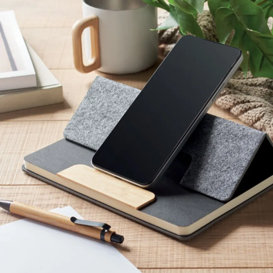 Set de carnets A5 personnalisable en feutre RPET à couverture rigide, intégrant une fonction support de téléphone. Un ensemble pratique et polyvalent pour le bureau ou les déplacements professionnels. Idéal pour associer prise de notes et usage mobile au quotidien.