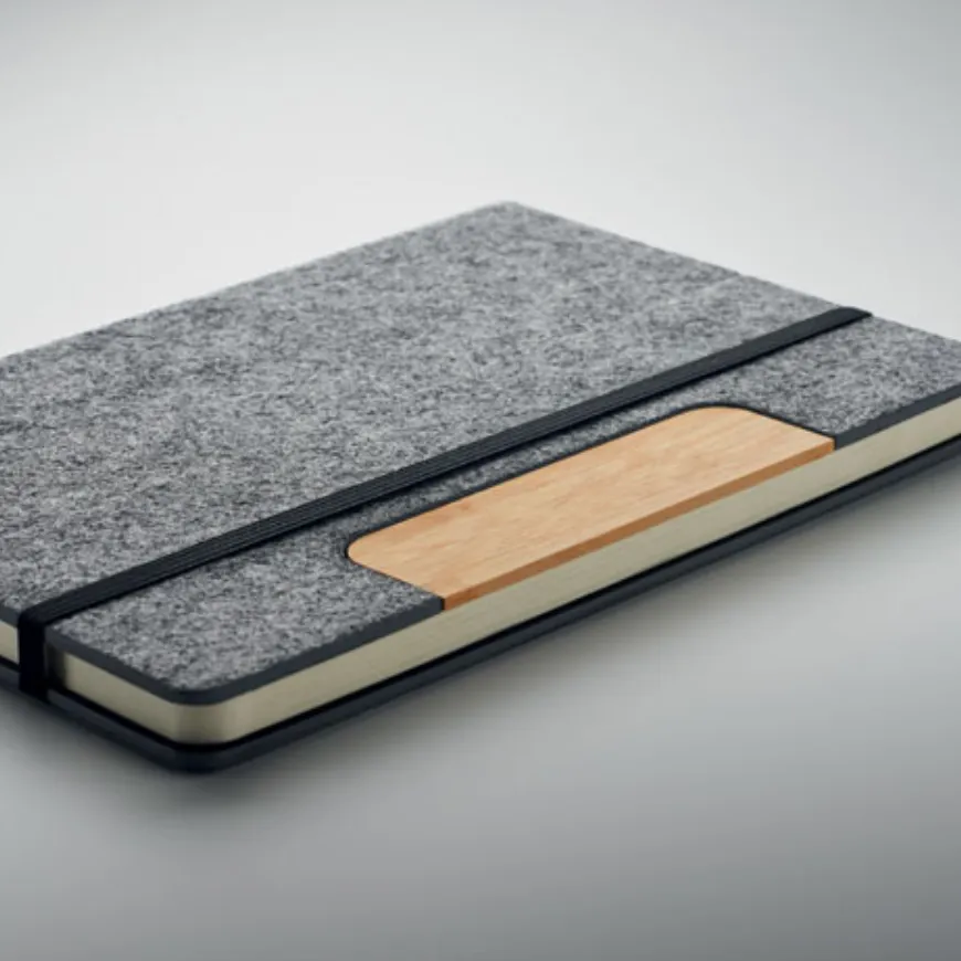 Ce set de carnets A5 personnalisable en feutre RPET est conçu pour répondre aux usages professionnels modernes. Sa couverture rigide intègre une fonction support de téléphone, permettant de consulter un écran tout en prenant des notes.
