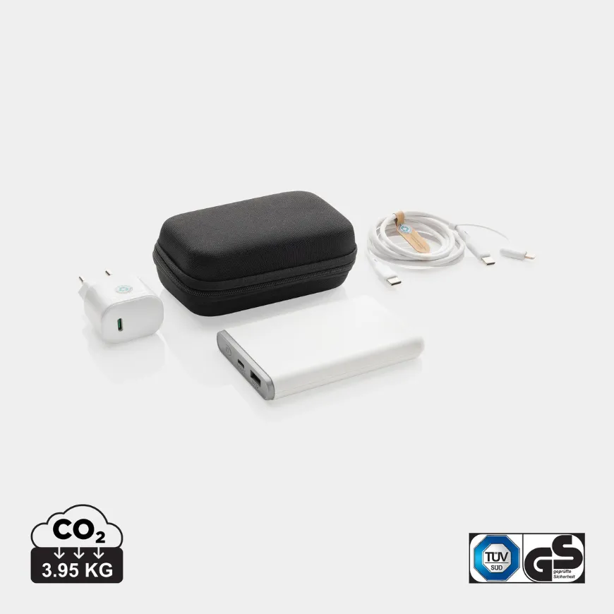 Le set P301.2601 intègre un adaptateur mural USB-C 20W, un powerbank de 5 000 mAh et un câble de 120 cm en TPE recyclé. Les composants sont fabriqués à partir de PC, ABS et TPE recyclés certifiés RCS, et l’ensemble est livré dans une pochette en PET recyclé certifié GRS.