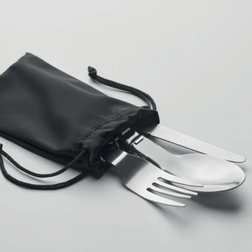Il comprend trois ustensiles en acier inoxydable, rangés dans une pochette en RPET pratique et résistante. L’ensemble est pensé pour un usage simple et fonctionnel, aussi bien en déplacement qu’en extérieur.