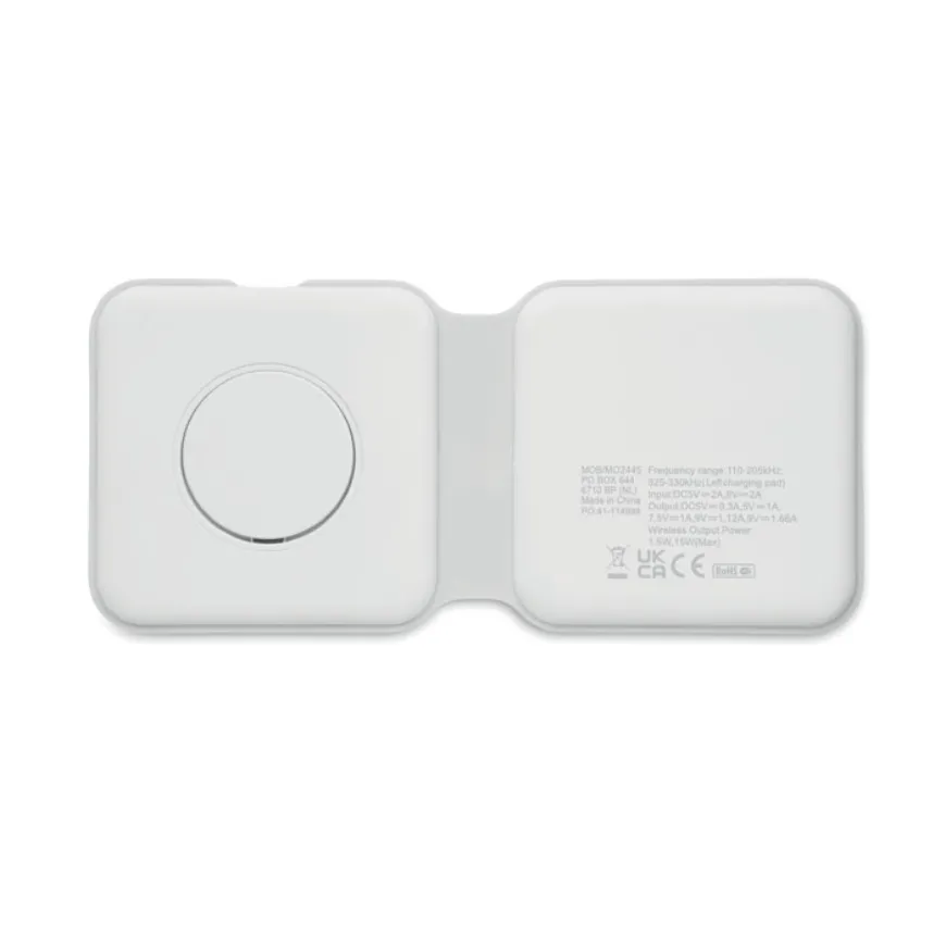 Elle combine un chargeur sans fil 15W pour smartphone et un chargeur dédié pour smartwatch, le tout intégré dans un corps en ABS.