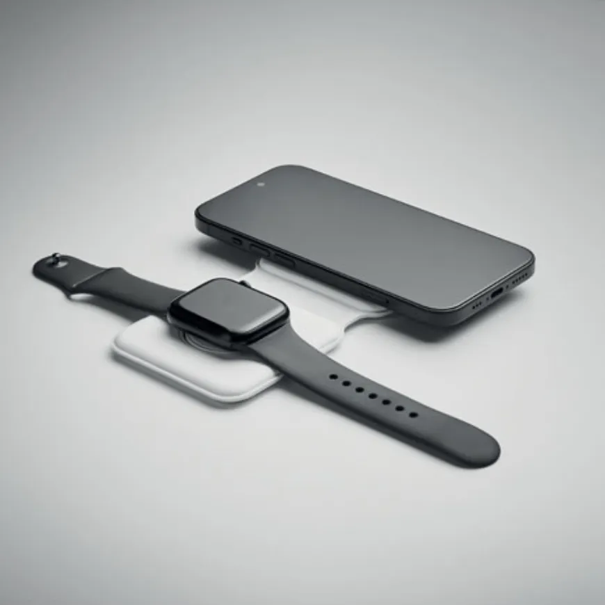 Station de charge 2-en-1 personnalisable au format compact, pensée pour un usage quotidien professionnel. Elle intègre un chargeur sans fil 15W et un chargeur pour smartwatch. Un support pratique et épuré, prêt à être personnalisé.