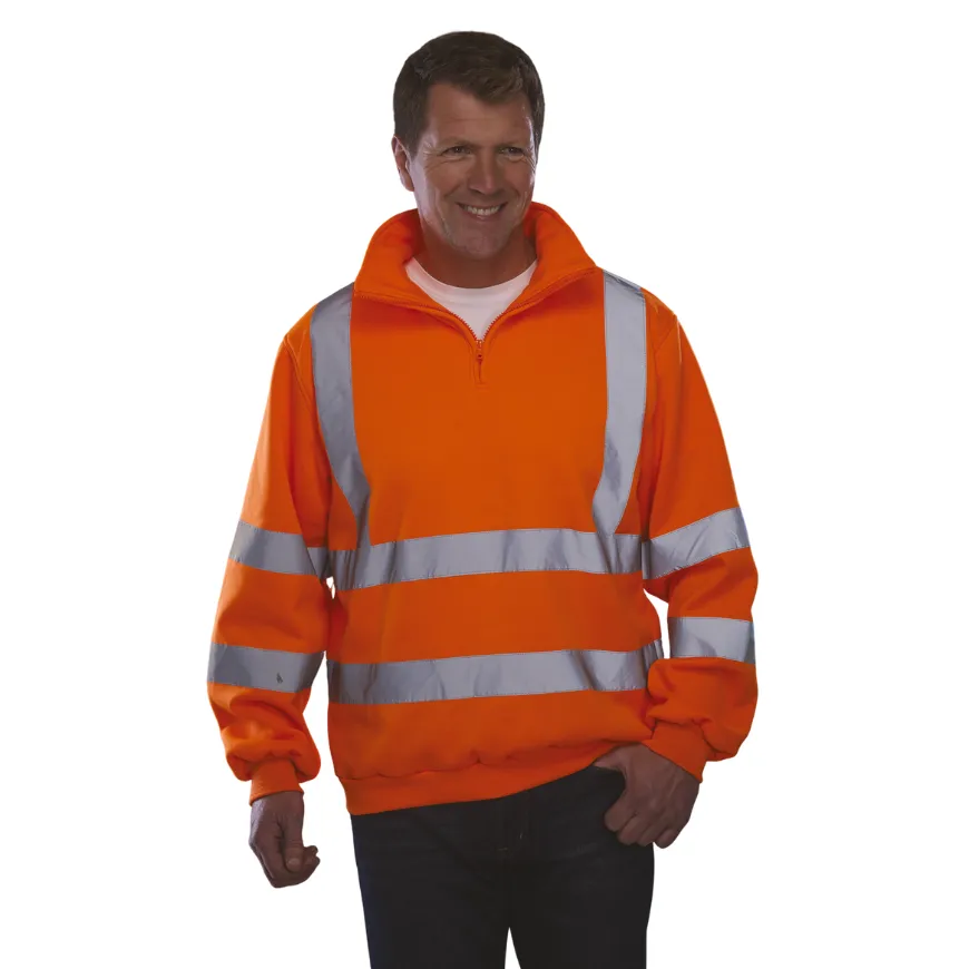 Équipé d’un col montant avec zip 1/4, d’une doublure jersey et de poignets et taille en bord-côte, ce sweat assure une coupe confortable et pratique. Les bandes réfléchissantes de 5 cm placées autour du corps, des bras et sur les épaules offrent une visibilité optimale, même en faible luminosité.