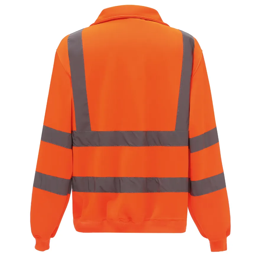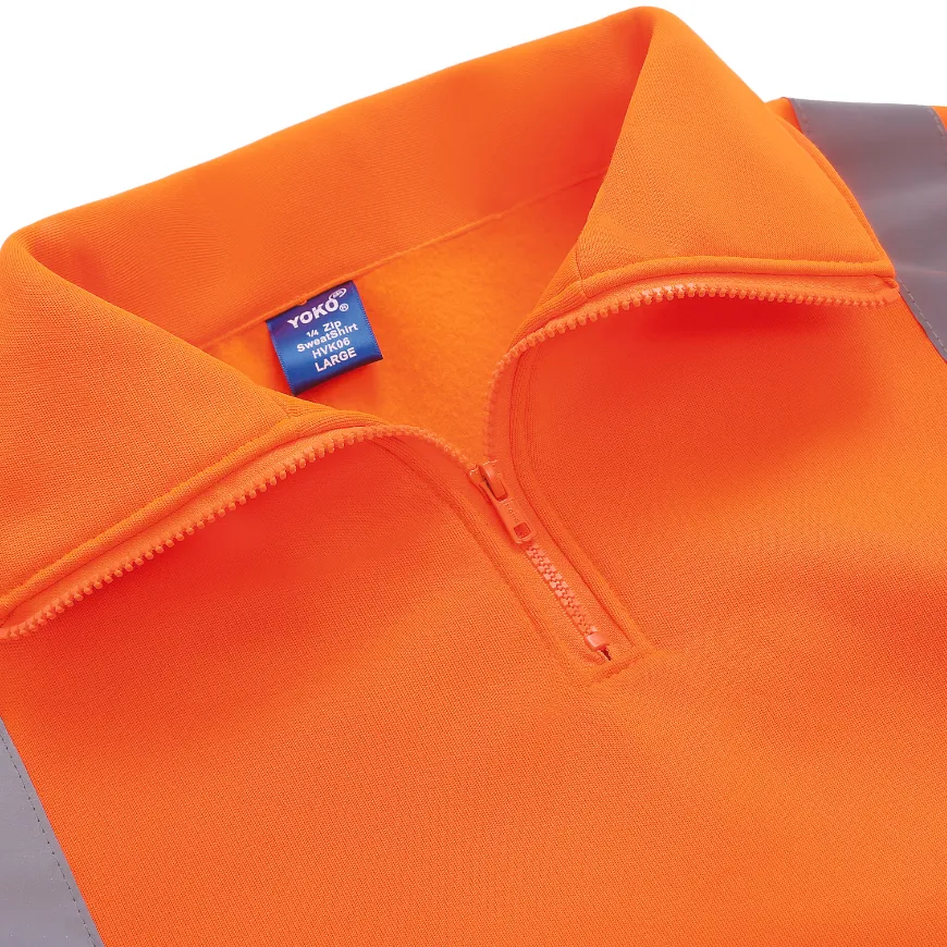 Le sweat-shirt haute visibilité personnalisable YOKO YHVK06 est conçu en 100% polyester antiboulouchage 280 g/m². Avec son col montant zippé 1/4, ses bandes réfléchissantes de 5 cm et sa certification EN ISO20471:2013, il assure confort, sécurité et visibilité pour ton équipe.