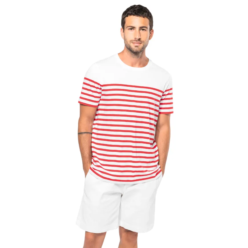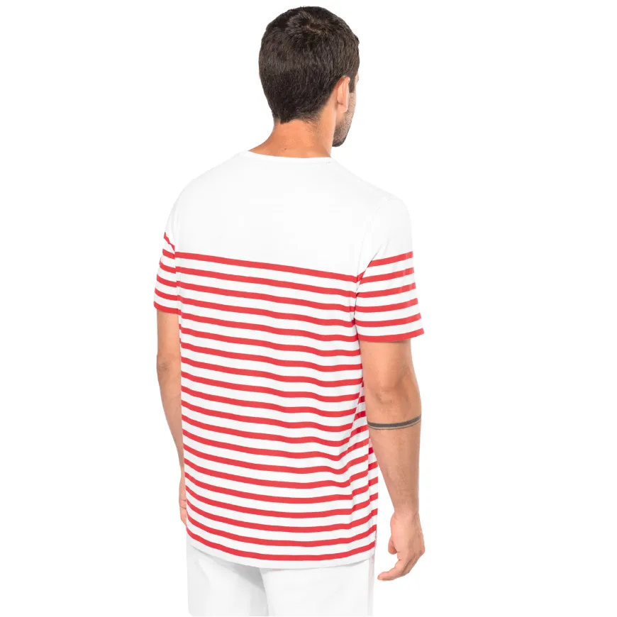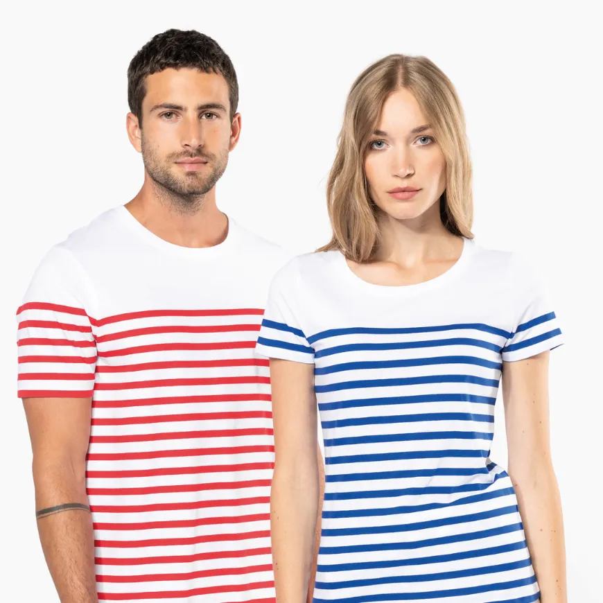 Le T-shirt marin bio personnalisable KARIBAN séduit par ses rayures tricotées et son coton biologique doux. Une pièce authentique et durable à personnaliser pour tes événements, équipes ou collections.