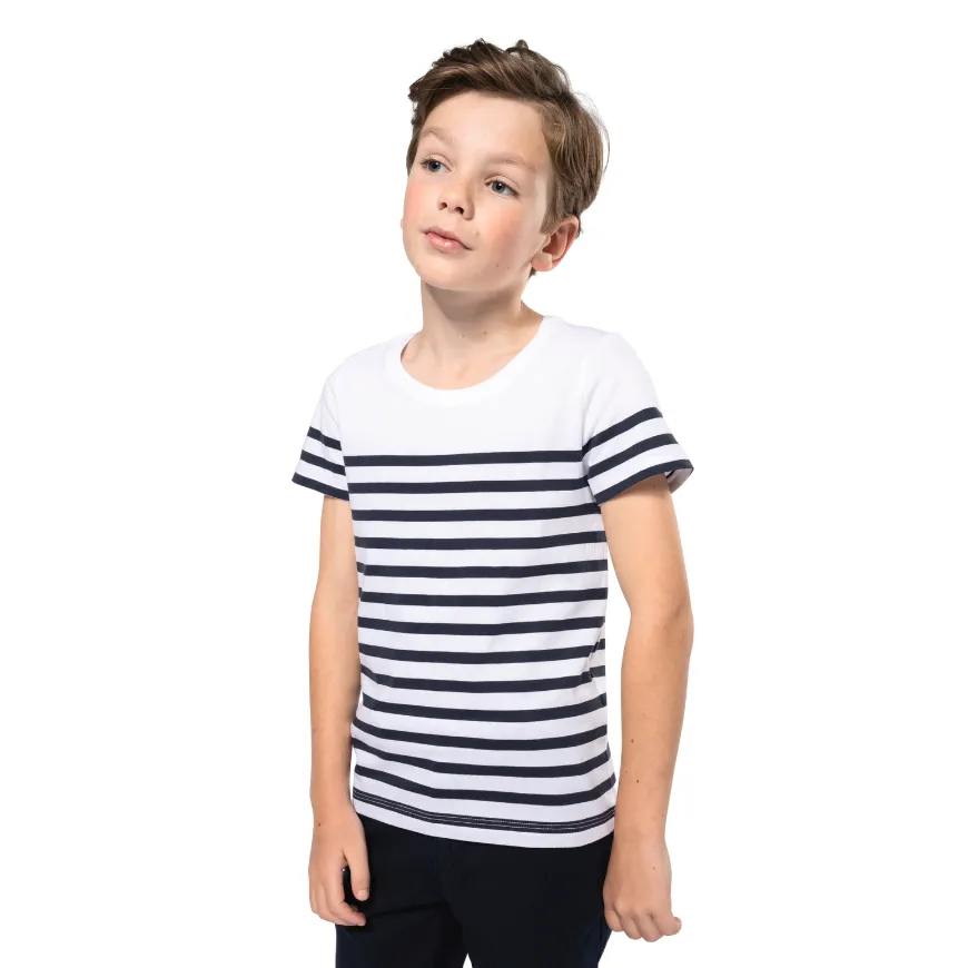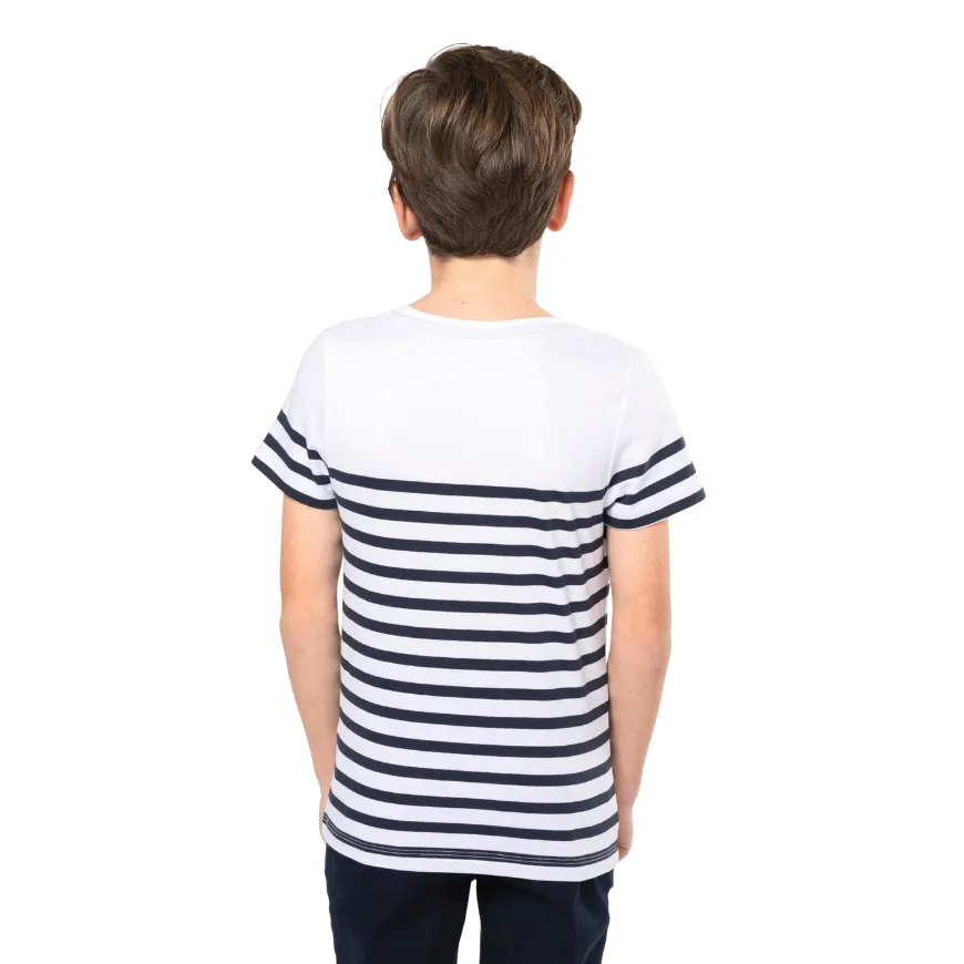 Le T-shirt marin enfant bio col rond personnalisable KARIBAN associe coton biologique, confort et style marin. Léger et doux, il est idéal pour personnaliser des tenues scolaires, clubs ou associations.