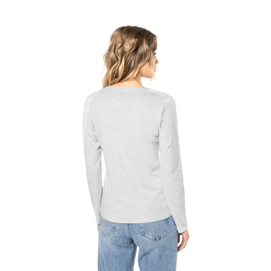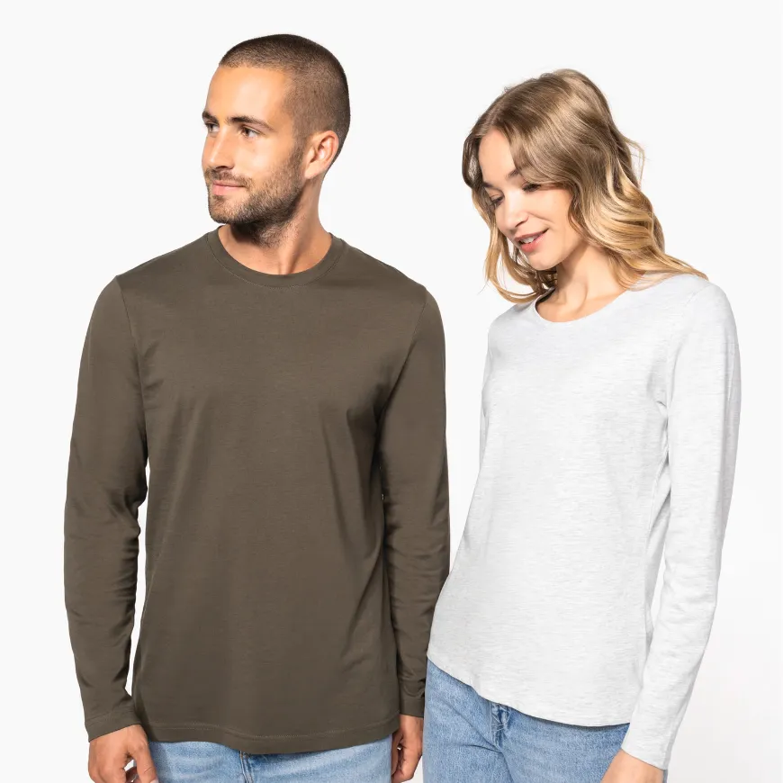 Le T-shirt manches longues col rond femme 180 g/m² personnalisable KARIBAN est conçu en coton peigné avec lavage aux enzymes, pour un toucher doux et une excellente imprimabilité. Parfait pour personnaliser ton logo.