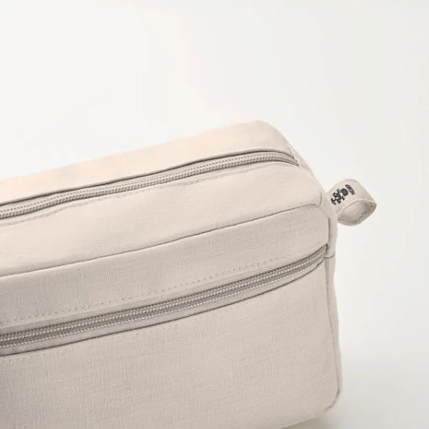 La trousse de toilette personnalisable Réf. MO6165 en chanvre naturel 200 g/m² est compacte, pratique et respectueuse de l’environnement. Avec sa double fermeture éclair et sa poche avant zippée, elle est parfaite pour organiser tes essentiels en voyage comme au quotidien.