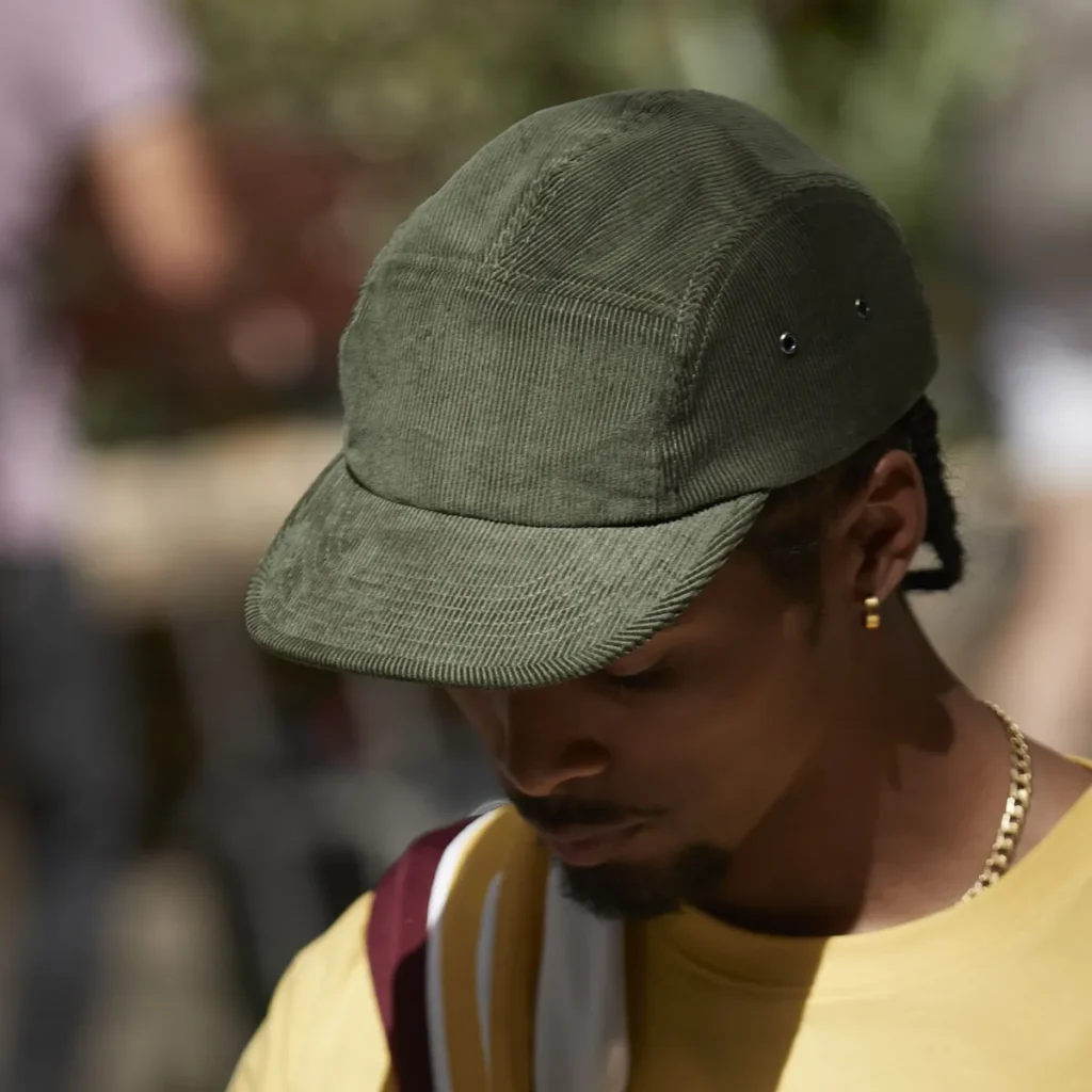 La casquette 5-panel (ou Camp Cap) se distingue par sa construction unique : cinq morceaux de tissu (un à l’avant, deux sur le dessus et deux sur les côtés).