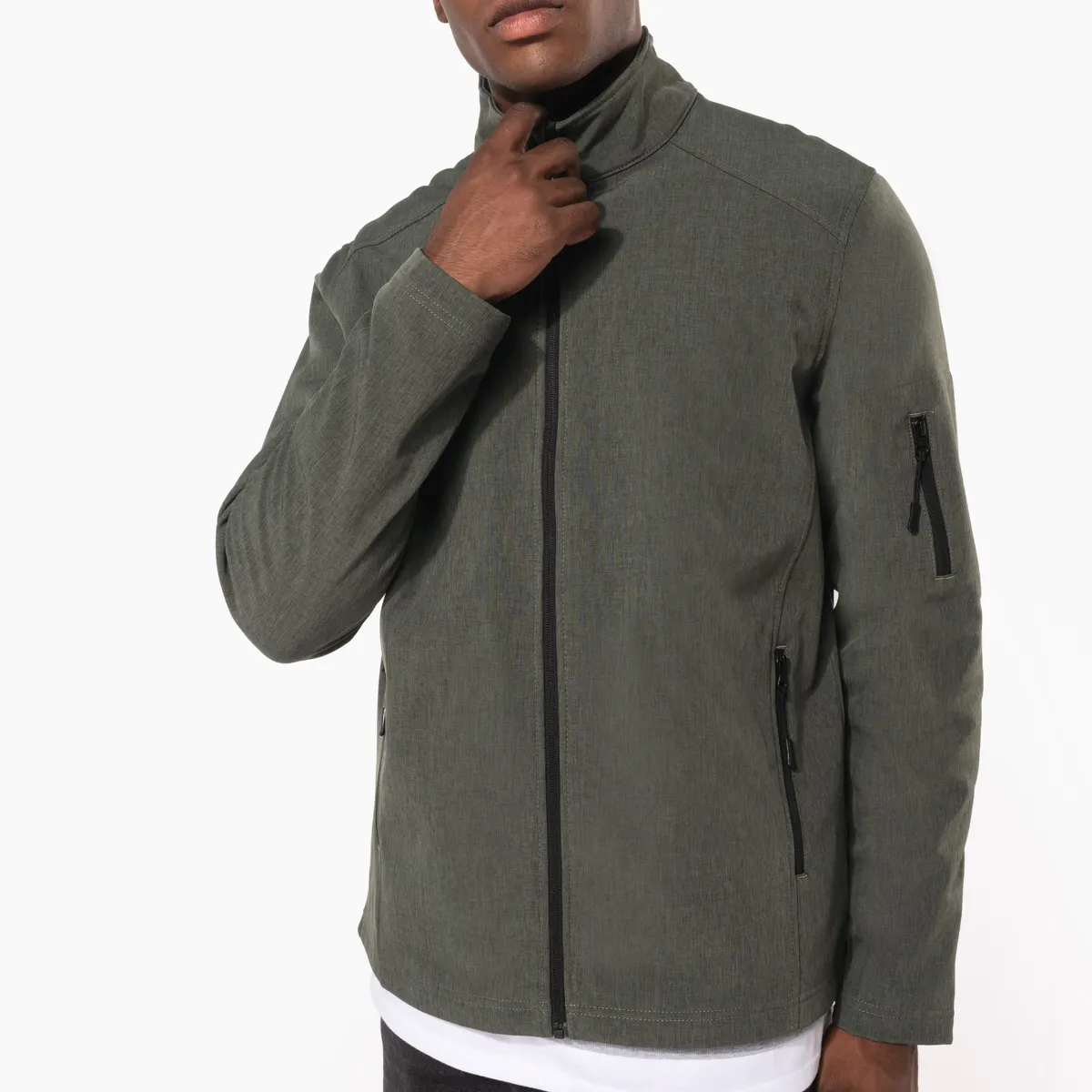 La K401 de KARIBAN est une veste softshell homme 3 couches en 300 g/m² taillée pour le terrain. Son tissu contrecollé en 95 % polyester et 5 % élasthanne avec membrane respirante et intérieur micropolaire t’offre un combo chaleur-protection difficile à battre. Elle encaisse 8000 mm d’imperméabilité et 3000 g/m²/24h de respirabilité — assez pour rester au sec sans étouffer.