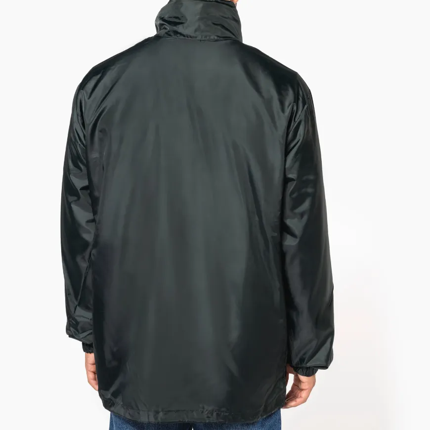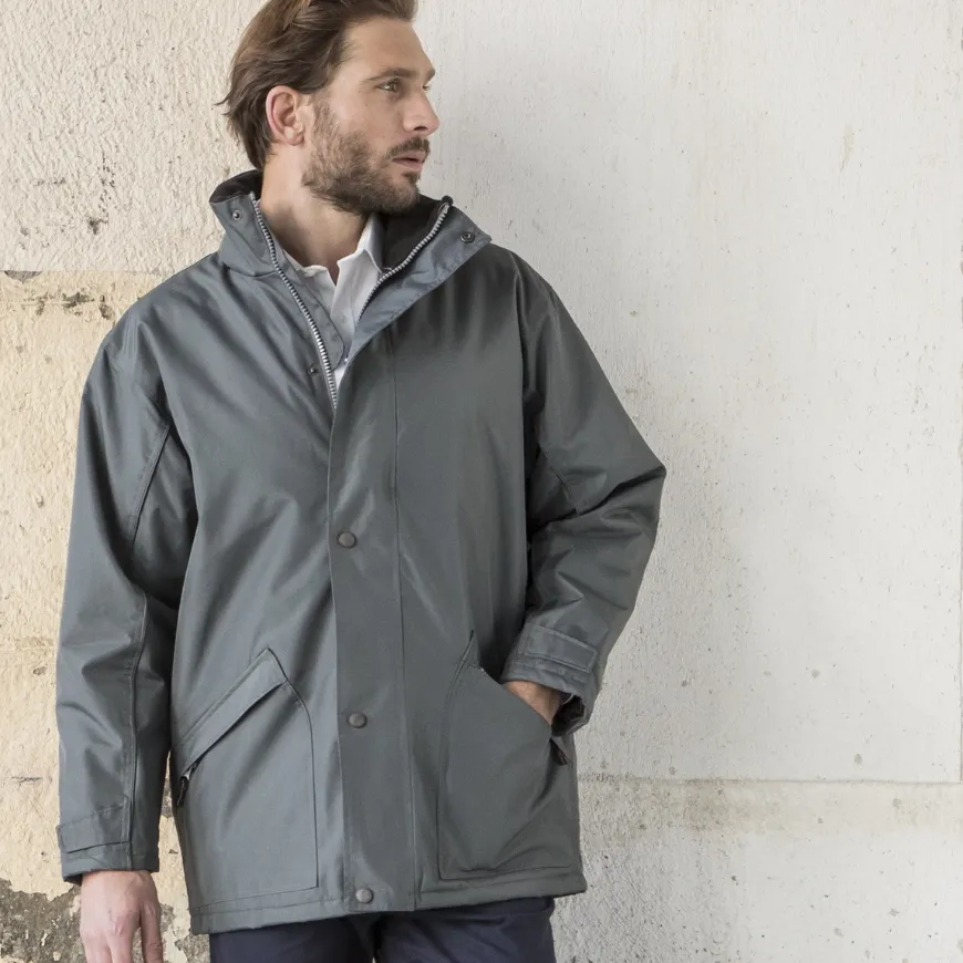 Parka imperméable : protection efficace contre la pluie et le vent, coupe longue et capuche intégrée.